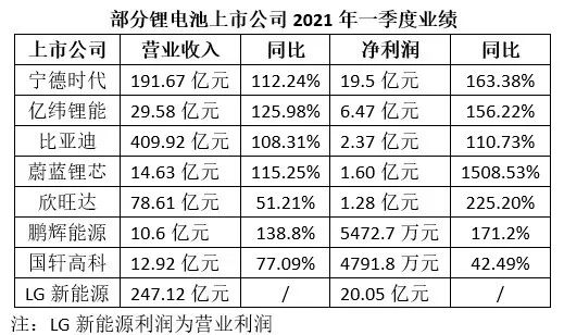 值得注意的是,這其中業(yè)績漲幅最猛的為鋰電上游材料企業(yè),如多氟多一季度業(yè)績增長74倍,贛鋒鋰業(yè)一季度業(yè)績也猛增60倍。反觀動力電池上市公司,業(yè)績雖然都有增長,但是受到上游材料漲價(jià)推高電池制造成本的影響,業(yè)績整體增幅不算特別突出。