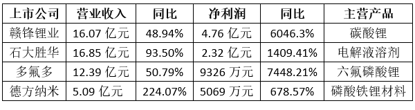 碳酸鋰價(jià)格的上漲直接推高了磷酸鐵鋰和六氟磷酸鋰等碳酸鋰下游材料的成本。受此影響,下游也掀起“漲價(jià)潮”。在產(chǎn)品漲價(jià)助攻下,相關(guān)上市公司業(yè)績也非常亮眼。