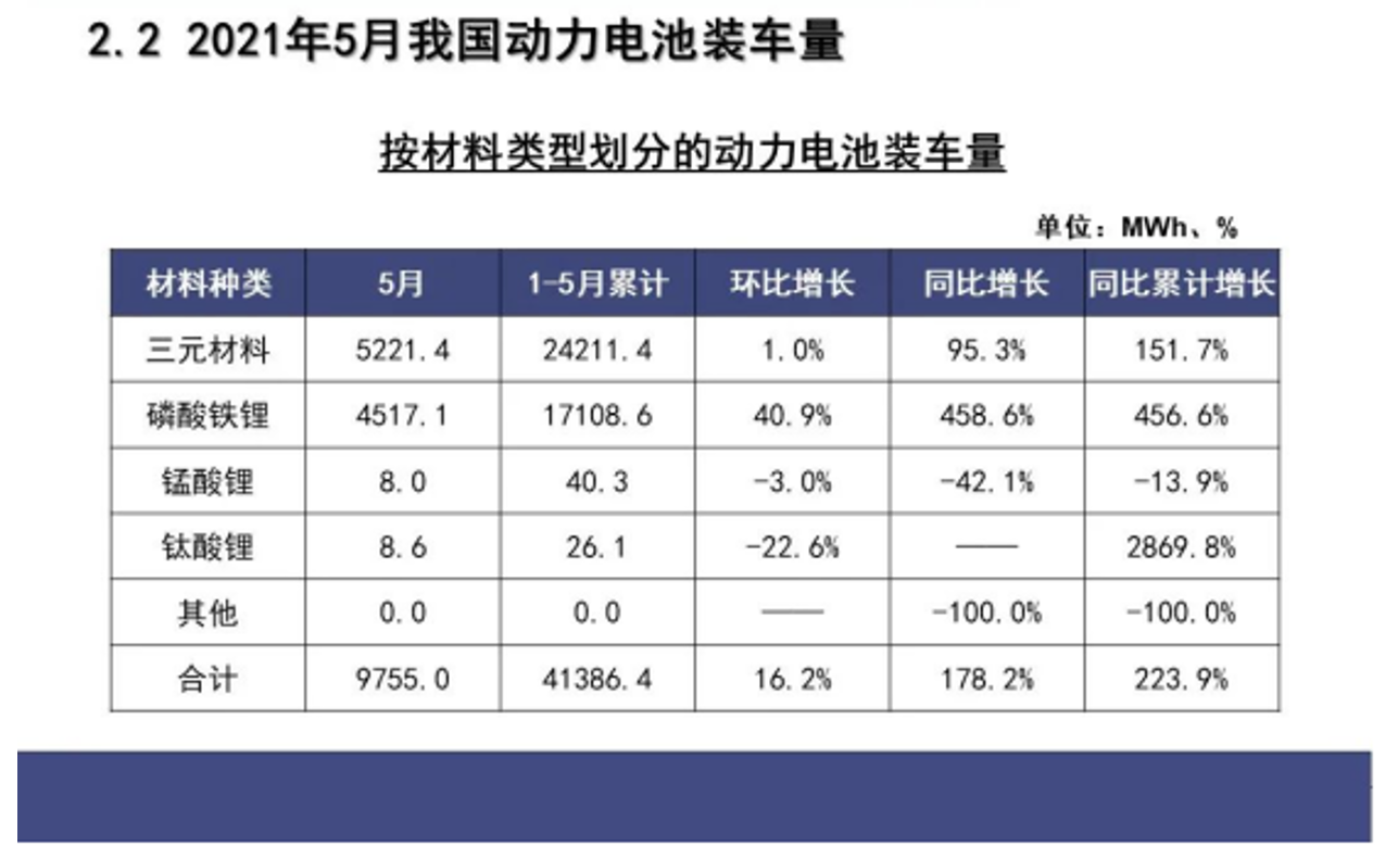 今年前5個月,我國動力電池裝車量累計41. 4GWh,同比累計上升223.9%。其中三元電池裝車量累計24.2GWh,占總裝車量58.5%,同比累計上升151.7% ;磷酸鐵鋰電池裝車量累計17.1GWh,占總裝車量41.3%,同比累計上升456.6%。
